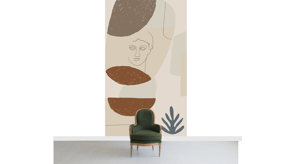 Le nom de cette fresque au style raffiné créée par Hubert Mardi, dessinateur et artiste peintre, résonne comme celui d’une œuvre dramaturgique grecque. On imagine ce décor très design en toile de fond dans un espace convivial où se jouent toutes les scènes de la vie quotidienne. Le visage d’un éphèbe à la morphologie athlétique se détache avec netteté et précision. Il nous convie à une contemplation de la beauté que l’on perçoit tantôt dans le ballet improvisé de deux mains qui se joignent, tantôt dans le délicat profil d’une silhouette féminine dénudée. Seul un vase d’un bleu puissant et les formes géométriques d’un brun soutenu habillent ce tableau pour une ambiance chaleureuse.